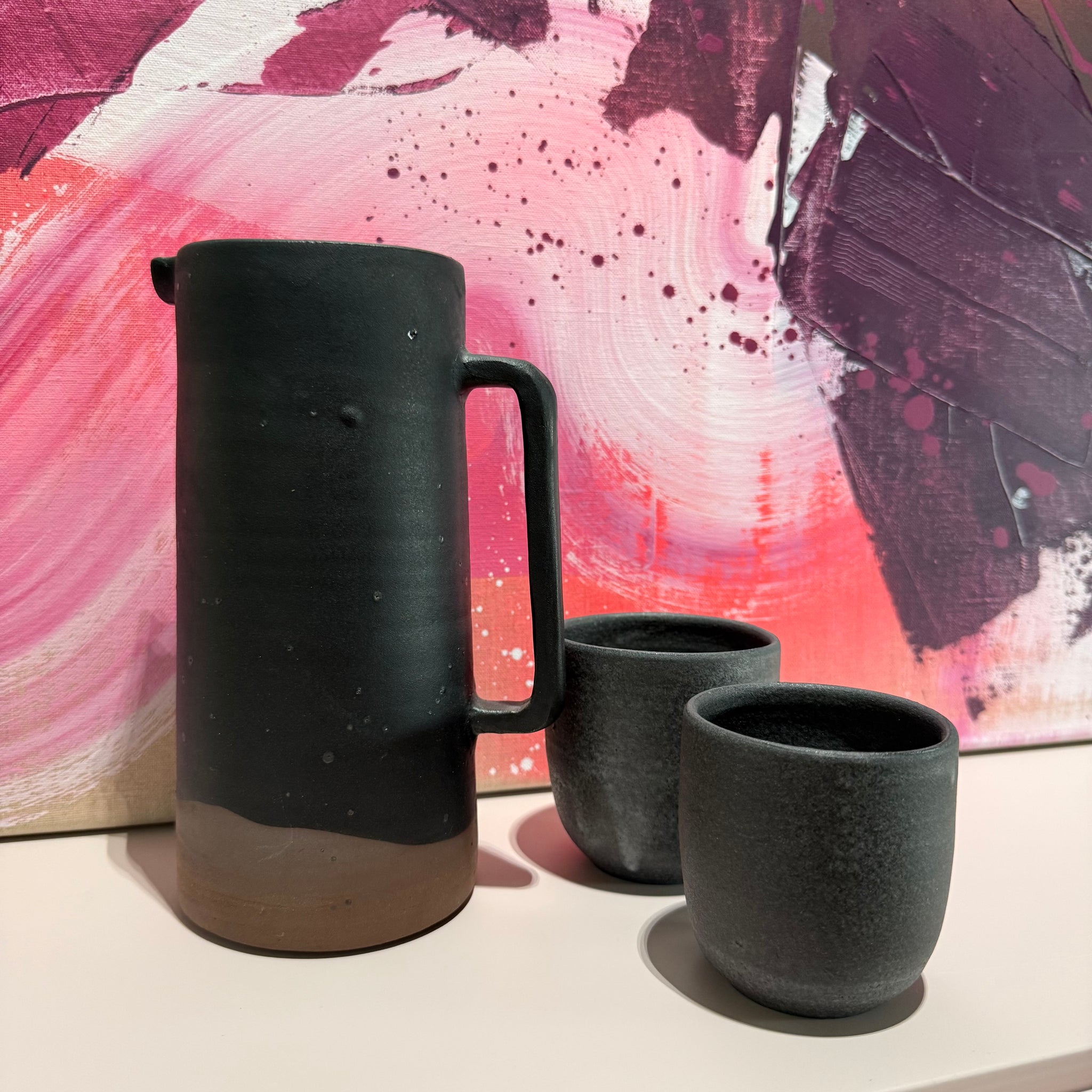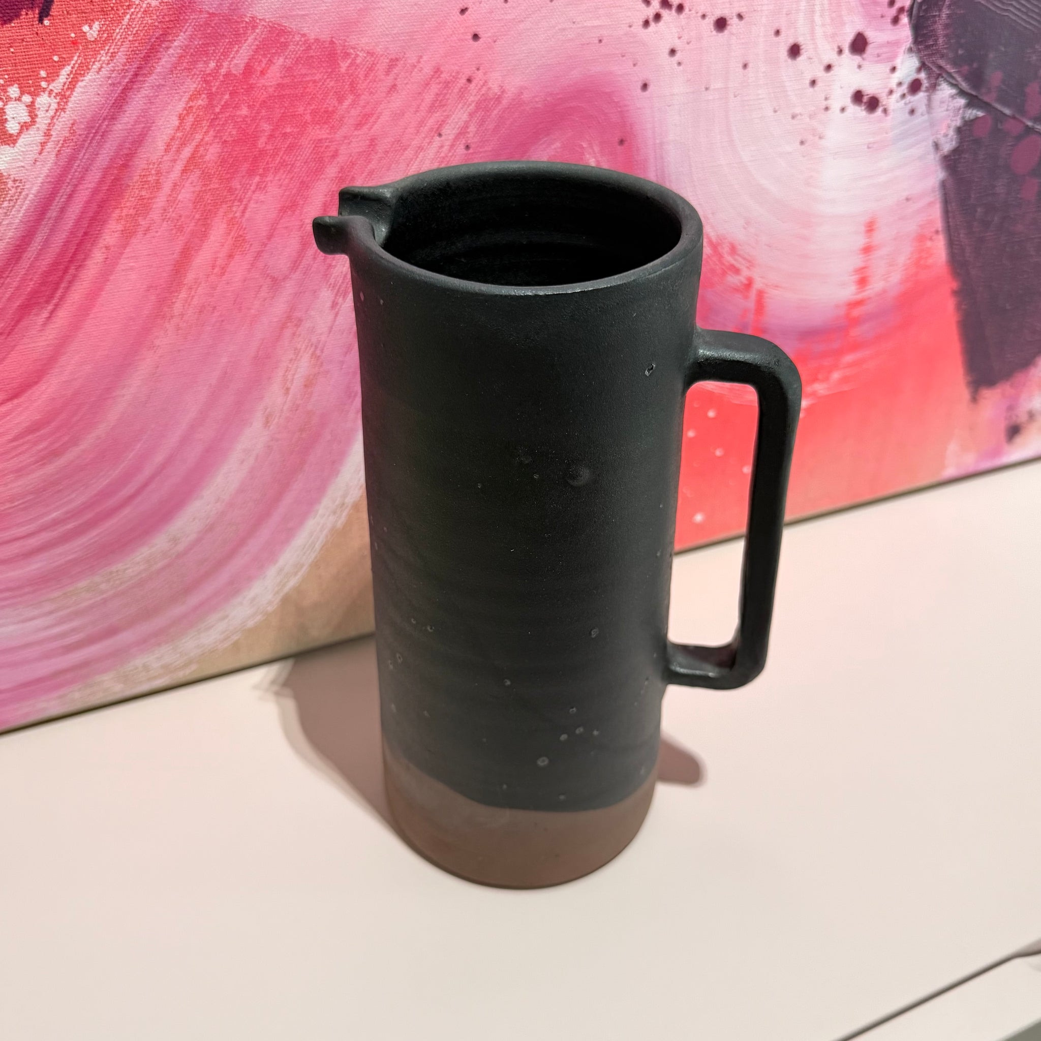 Schwarz-braune Karaffe mit matter Oberfläche.